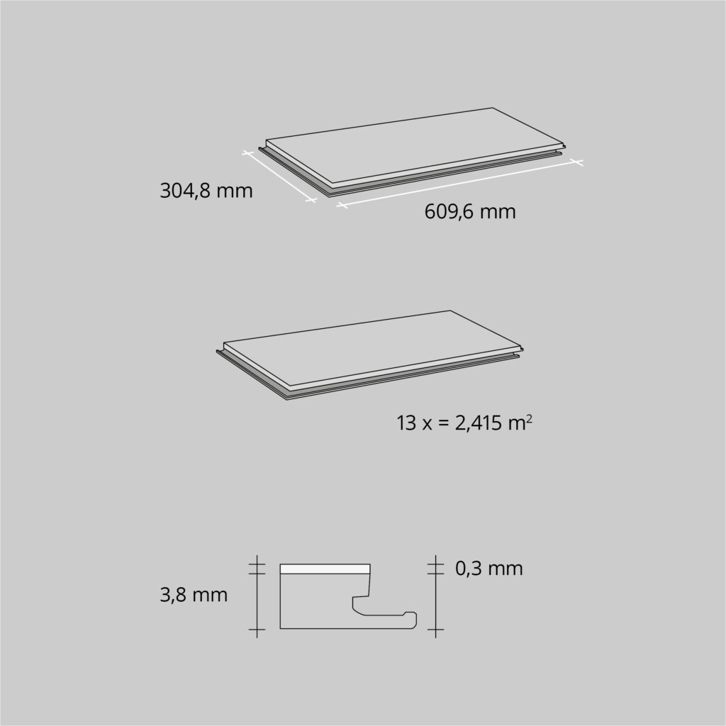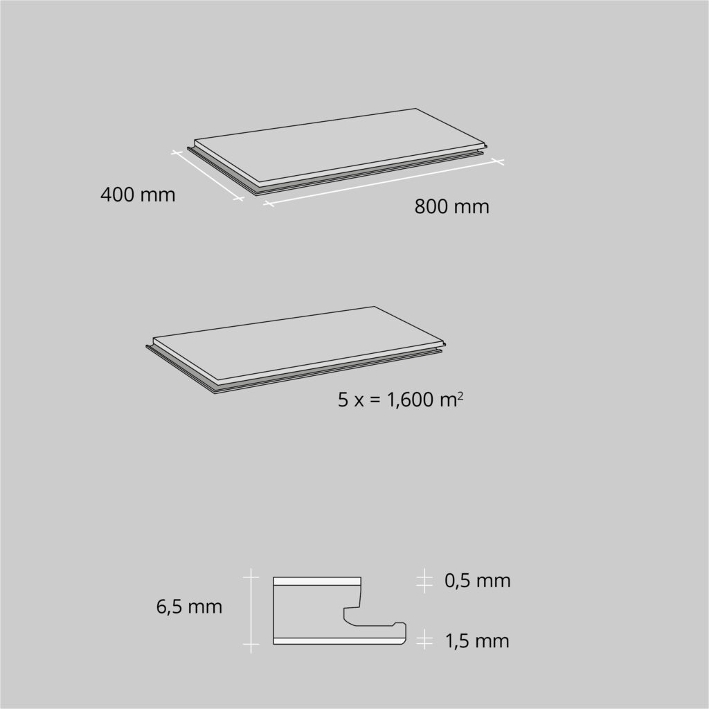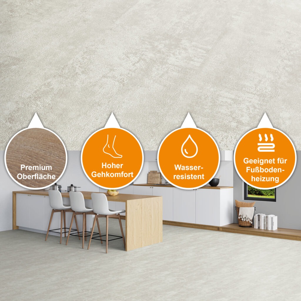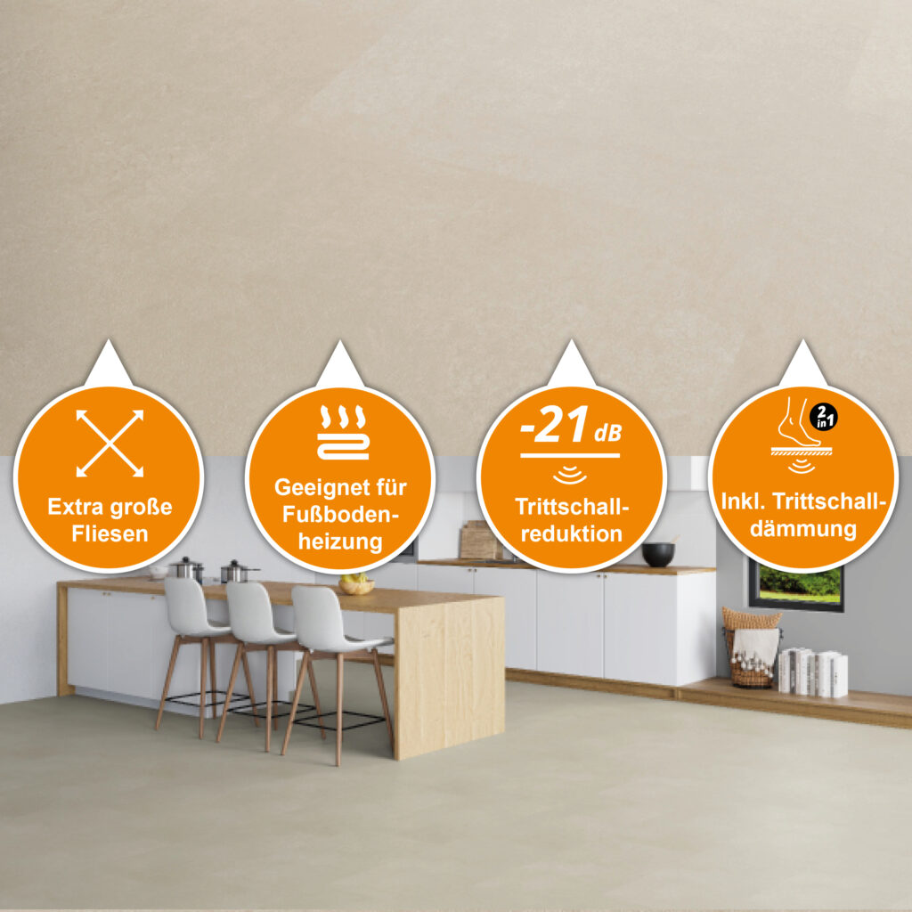 - Verlegbar auf Flächen von bis zu 400 m² ohne Dehnungsfuge