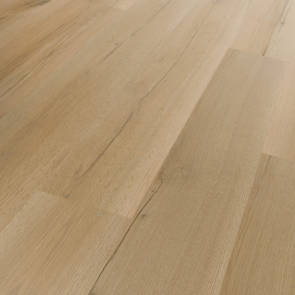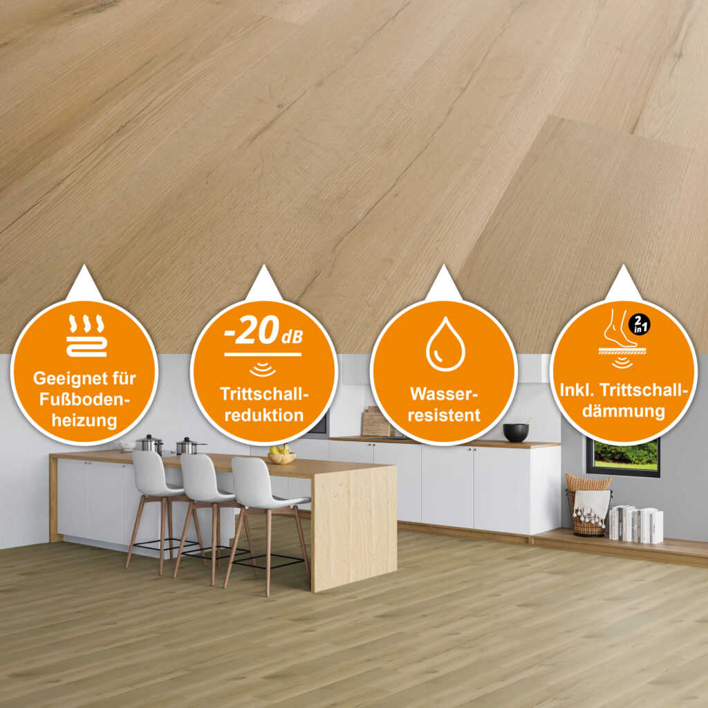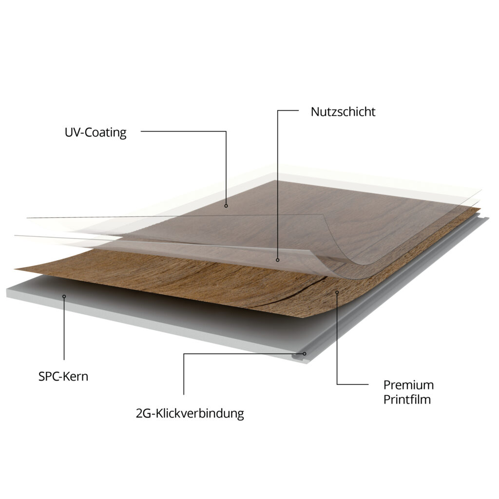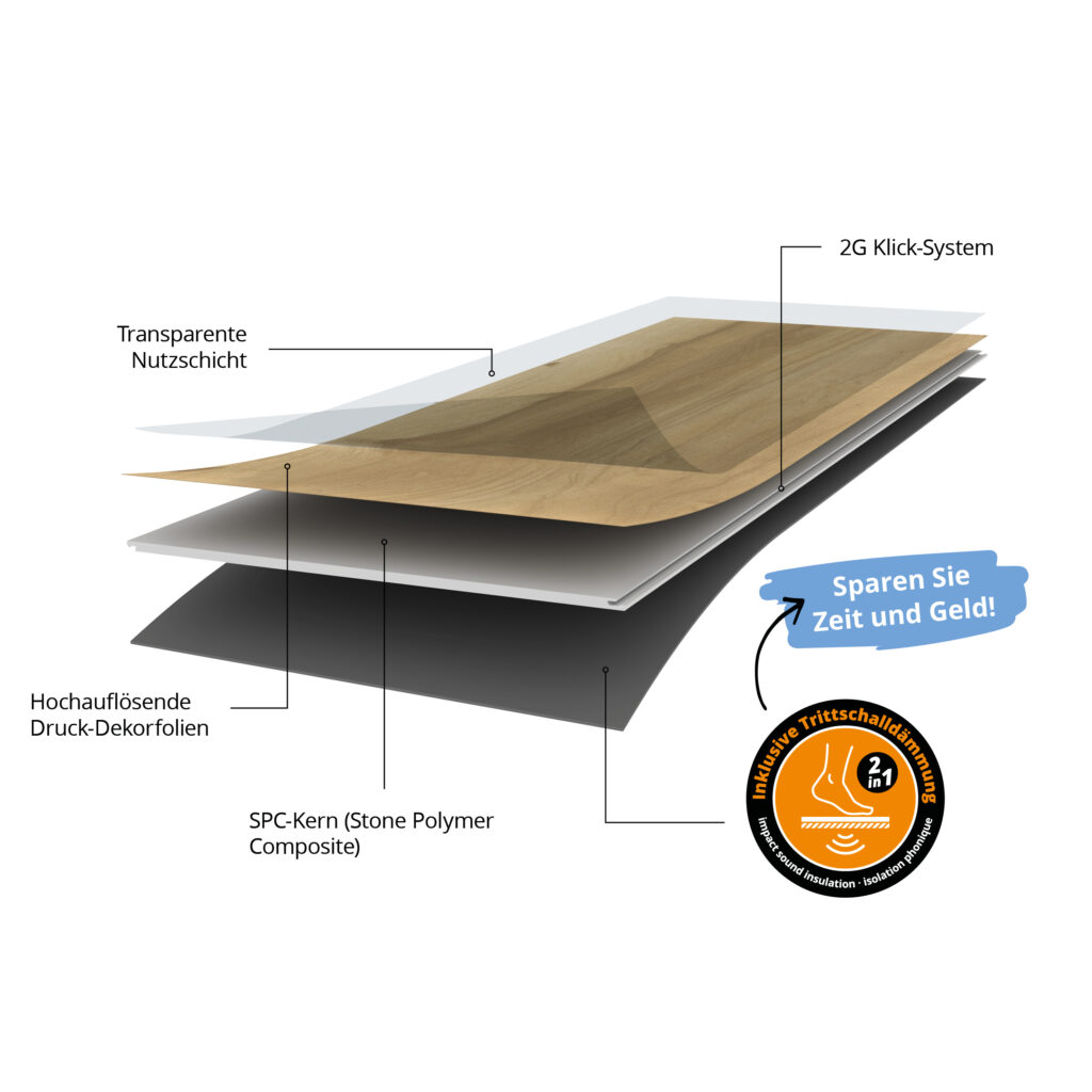 sind zertifiziert vom Sentinel Haus Institut und unempfindlich gegenüber Wasser. Dadurch können Sie einen einheitlichen Bodenbelag in Ihrem gesamten Haus verlegen: Das heißt vom Eingangsbereich über das Wohnzimmer bis hin zu Feuchträumen wie Küche und Bad. Außerdem eignen sich die SPC-Böden auch ideal für die Renovierung oder den Objektbereich.